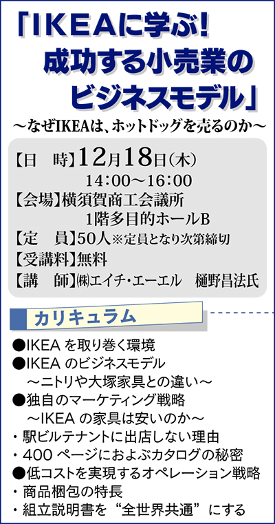 横須賀商工会議所では12月18日(木)、地域の活性化に取り組む事業者や一般市民を対象に経営力強化セミナーを開催する。2006年に日本に再上陸してから快進撃を見せている世界最大の家具小売りチェーン「IKEA」(イケア)を題材にそのビジネスモデルを学ぶ。