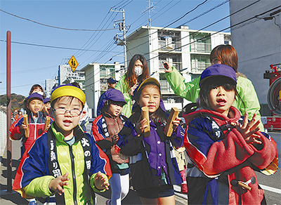 金谷にある若葉幼稚園の園児が15日、火災発生の注意を呼びかける啓発活動を行った=写真。はっぴを纏い拍子木を鳴らしながら元気いっぱいに「火の用心」を連呼。園周辺の住宅地などを練り歩くと、近隣の住民から声援が送られた。