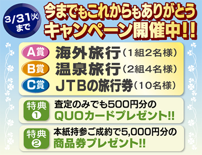 今ならタウンニュースを持参して無料査定すると、500円分のクオカード、ご成約の場合は5千円分の商品券をプレゼント(3月31日迄)。お得なこの機会にぜひ。