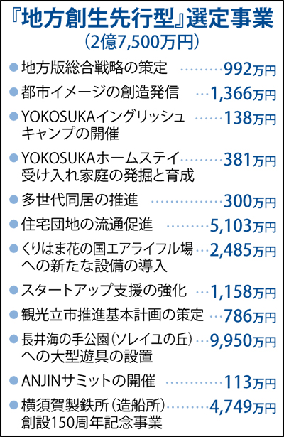 同交付金の種類は2つ。経済対策として、個人消費などに直接結びつく「地域消費喚起・生活支援型」では4・9億円を計上。プレミアム商品券やはつらつシニアパスの発行、学童クラブへの助成・支援、住宅リフォームの助成の4事業となる。また、人口減少対策や創業支援・観光振興など地域活性化を図る「地域創生先行型」では2・7億円を盛り込んでいる。各自治体が自由に事業設計できるとしており、英語教育の強化や、住宅団地での空き家バンクの開設と市外から転入に対する購入・引っ越しなどの助成、創業や新事業展開支援の強化、横須賀製鉄所創設150周年記念事業のほか、長井海の手公園(ソレイユの丘)への大型遊具の設置など12事業。人口減少や、経済活性など地域社会の課題に対する「地方版総合戦略」の策定も含まれる。