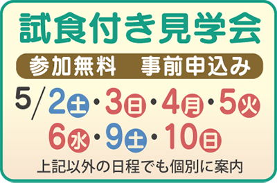 見学会は事前予約制。「体験入居」制度もあり、夫婦などは1人分の料金で試せるうえ、本入居時は「夫婦割引」の特典が受けられる。