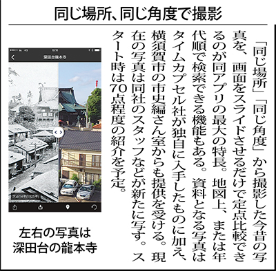 スマートフォンアプリ開発会社のタイムカプセル(株)(事業所=汐入町1の24の4)は、横須賀の今昔の写真を並立して見比べることができる専用アプリを立ち上げる。「横須賀今昔写真」のタイトルで5月下旬の配信を予定。利用者は無料で閲覧できる。郷土愛を育むツールとしての活用も意図しており、今はなき建物や懐かしの風景などを写した写真の提供を呼び掛けるイベントを実施しながら市民参画で掲載情報のボリュームを増やしていく計画だ。