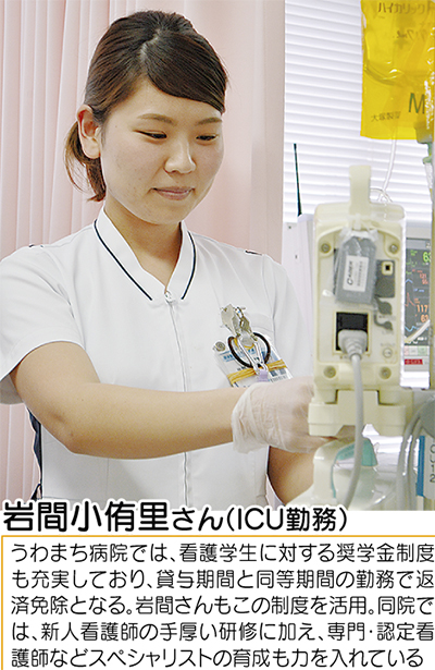 初めての配属は救命救急センター。幅広い看護知識が求められる中で経験を重ねた。現在は、急性期の患者に対応するICUの勤務。一般病棟と違い、診療科も横断する。患者を見守る家族との関わり方なども勉強の日々だ。同専門学校から「うわまち」への就職は毎年10人程度。同期と切磋琢磨する環境も、大きな刺激になっている。