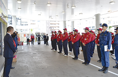 高齢者が車の運転操作を誤って計量機に衝突する事故が市内でも複数報告されていることなどを受けたもの。各スタンドでは災害対応マニュアルや消火設備を有しているが、消防局と連携して行う訓練は今回が初めて。「現場のスタッフが慌てずに行動できることが大切。燃料販売会社として安全管理を徹底していきたい」と同社の大場大社長は話した。