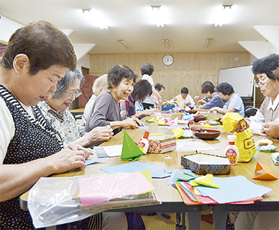 池田町内会の「いきいきサロン」に所属するメンバー約30人が七夕飾りを製作中だ。飾りは折り紙を始め、和紙やチラシ、さらには宝くじのはずれ券などを使ったもの。完成した作品は7メートル近くある笹に短冊とともに飾られる予定。「市内ではかなり大きい方ではないか」と同会代表の小野寺純子さん。同町内会館前(池田町2丁目13の5)に7日(火)から1週間ほど展示される予定。
