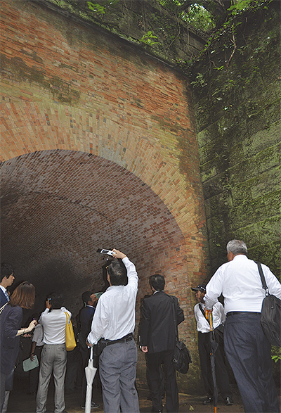 猿島に残る煉瓦遺構の保全のため、保全や修復を行う県タイル煉瓦協会など4団体が先月31日、現地を視察した。島内の兵舎小屋や弾薬庫、トンネルなど、歴史的価値の高い貴重な建築物をガイドの案内で回った。