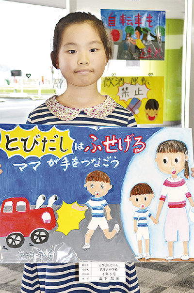久里浜地域の小学生が製作した「交通安全ポスター」の表彰式が先月26日、久里浜中央自動車学校で行われた。交通意識の啓発を目的。73人の作品から最優秀賞に選ばれたのは久里浜小3年の山下加廉(かれん)さん(9)の作品。「弟がよく飛び出すので、注意してほしいという思いで描いた」と話した。