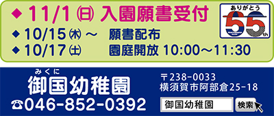 横須賀市と葉山町の市境に位置し、創立55周年を迎えた「御国(みくに)幼稚園」。緑に囲まれ、園内には自然豊かな広場のある環境で「心やさしく、たくましい子どもに」を教育方針に掲げる。