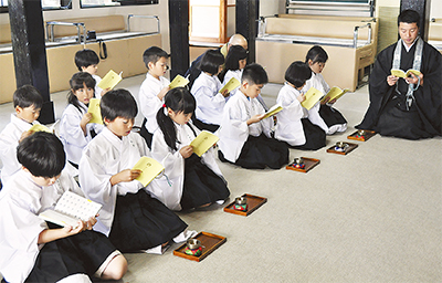 「み仏の み教えを きくものは なかよく やさしく 礼儀正しく いたします」――。揃いの装束に身を包み、仏教の教えを唱和する子どもたち。気分は立派な「お坊さん」だ。