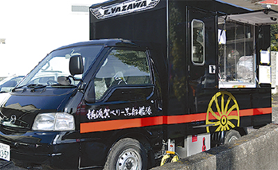 休日は老人会や誕生日会などへ出張販売。そこで人気なのがイカ墨を使用し、黒船をイメージさせる真っ黒なルーが特徴の「横須賀ペリー黒船カレー」。食すと臭みは全くなく、じっくり煮込んだ玉葱と牛すじ、数種の隠し味を混ぜた一品はまろやかに仕上がっており、口の中でとろけた。