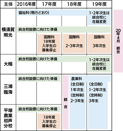 三浦臨海と平塚農高初声分校は1期計画のなかで一番早い18年度内の統合をめざす。学科は単位制による全日制の普通科と農業科の2つ。現在、平塚農高では、昼間定時制として生徒を募集しているが、統合以降は全日制に変更となる。校舎・敷地は三浦臨海高を使用し、平塚農高初声分校は農業科の教場として活用される。