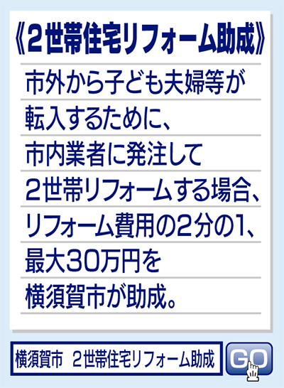そうしたメリットを踏まえ、市では定住促進の一環として2世帯住宅リフォームに助成金を交付する制度を設けました。市外に住む子ども夫婦世帯等が転入するために、自宅をリフォームする方が対象。市内業者に発注して2世帯リフォームするとリフォーム費用の2分の1、最大30万円を助成します。