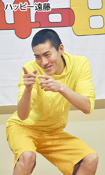 ピン芸人のハッピー遠藤(24)は、野比出身。芸人養成学校を経て現在は松竹芸能に所属。「ハッピー、アンハッピー」のフレーズを連呼し、身体をくねらせナンセンスギャグを連発。子どもたちの爆笑を誘った。