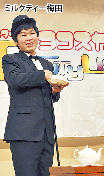 岩戸在住のミルクティー梅田(21)も養成学校出身。英国紳士を気取り、ミルクティーをすすりながらギャクを放つ独自の芸風を模索中だ。今回の出演は、主催者に直談判して機会を得た。横須賀・横浜を拠点に活動している。