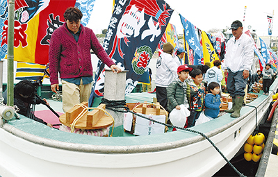 漁師にとって船は特別な存在だ。長井では船の完成を祝って、地域にお披露目する進水式を行うのが古くからの習わし。大漁旗を船上にはためかせて、餅投げなどの振る舞いを行った。式典後の祝賀会には、地域住民も参加した。