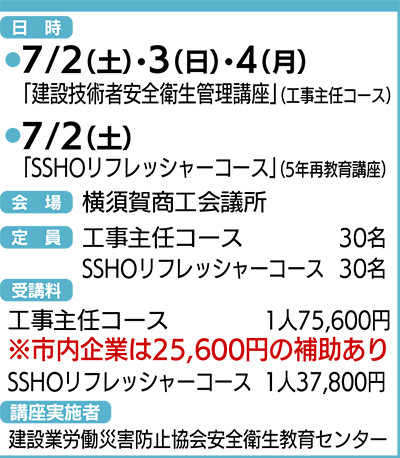 横須賀市内にある防衛施設や米海軍基地との取引拡大を支援している横須賀商工会議所(平成町2の14の4)では、「建設技術者安全衛生管理講座(工事主任コース)」と更新者向けの「SSHOリフレッシャーコース(5年再教育講座)」を開講する。