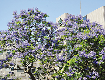 ジャカランダは、アフリカ原産の高木で「世界3大花木」のひとつに数えられている。桜と同様、花が咲いた後に葉を出すことから「紫の桜」「熱帯の桜」とも呼ばれている。同大に植えられている木が日本最北限という。