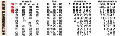 参議院議員選挙の投開票が7月10日に行われた。4議席を12人が争った神奈川選挙区では、自民党の現職・三原じゅん子氏(51)が約100万票を獲得し、トップ当選。以下、公明党の新人・三浦信祐氏(41)、民進党の元職・真山勇一氏(72)、無所属の現職・中西健治氏(52)が当選した。自民党は選挙後に中西氏を追加公認し、与党が3議席を獲得した。