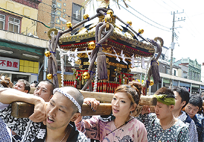 地域の高齢化などで担ぎ手が減り、昭和63年の祭りを最後に神社内で眠っていた同神輿。当時は、上町の大通りを渡御し、街を賑わせていたという。「神明社氏子会」代表の竹内恒明さん(上町在住)は、当時の活気づく街の写真を目にしたことを機に、神輿復活を願い活動してきた。「やっと実現した”完全復活”に、当時を思い出して喜んでくれる年配者もいた。これからも大切に伝承していきたい」と語った。