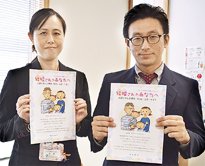 「ハッピーマイプラン事業」では県内初の妊活支援として、パンフレットを作成。「夫婦で考える健康・妊娠・出産・子育て」と題し、まずは、子どもの有無など夫婦各々のライフプラン(将来像)を描き出すことを提案する。さらに、妊娠・出産を希望する人に向け、市内の子育てサービスや不妊治療の助成制度などをまとめた。4200部作成し、婚姻届を提出した夫婦等に配布している。