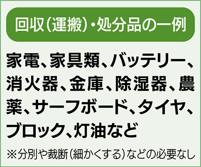 一般家庭、事業所のどちらも対応。日曜・祝日の作業依頼を受けているほか、月曜日から土曜日は持込み処分OK(年内は12月30日まで受付)。見積り無料。