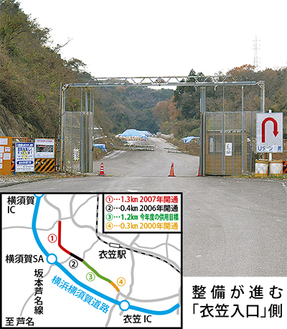 同線とつながる坂本芦名線では、横須賀SAに直接乗り入れできるスマートICを設置予定。市によると現地の土質や測量を進めている段階で、2020年度の供用開始を目指している。