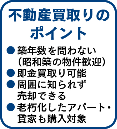 戸建て、土地、マンション、アパートが対象。築年数の経過による汚れや傷み、室内状況は問わない。昭和築(築後28年以上経過)の物件を特に求めている。物件の調査・査定費用は無料、即金買取り可能。「自宅の売却が近所の噂になる」「家の内覧・見学に何人も訪れる」などの心配がなく、他人の目を気にせずに売却できる。修繕費用ばかりがかさみ家賃収入が上がらないアパートや貸家の相談にも応じる。
