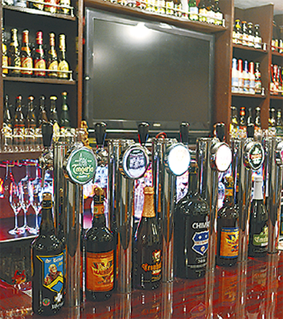 ドアを開けると目に飛び込んでくるのが、ずらりと並んだビール瓶=写真下=。ベルギービール専門店として2年前にオープン、昨秋からランチの営業を始めている。