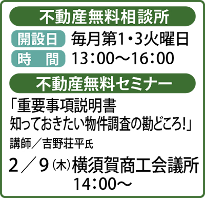 (公社)神奈川県宅地建物取引業協会 横須賀三浦支部(横須賀市米が浜通1の4の3)では、不動産取引に関する困りごとなどに無料で応じる「不動産無料相談所」を定期開設。専門相談員から適切な助言を受けられる。無料セミナーも開いており、2月9日(木)には、売買契約時に不動産会社が購入予定者に行う「重要事項説明」をテーマに、確認しておきたいポイント解説する。