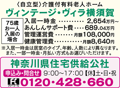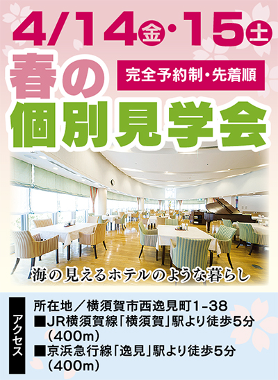 神奈川県住宅供給公社が事業主の「自立型」介護付有料老人ホーム ヴィンテージ・ヴィラ横須賀。同ホームの「春の個別見学会」が4月14日(金)・15日(土)に開催される。完全予約制・1日限定3組。先着順。