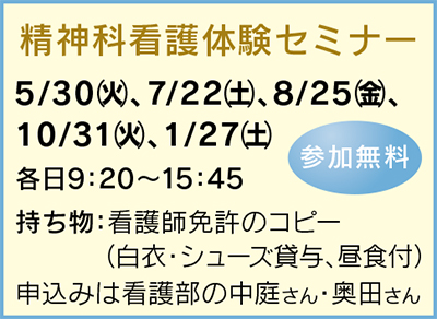 同病院では復職・転職支援の相談を随時受付け。体験セミナーの参加者も募集中。■福井記念病院/三浦市初声町高円坊1040の2(三浦海岸駅から無料送迎バスで8分)/【電話】046・888・2145