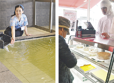 久里浜港内には新たに2つの企業が進出して、今年から店舗を構えている。ウイング興産(株)が運営する飲食店「漁師料理よこすか」、温泉施設「海辺の湯久里浜店」=写真左=は5月の連休中だけで約2万人が来客。市外からの観光客も多いという。