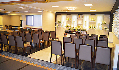 公郷町の「メモリーロードちかの」(近野葬儀社)では、親族だけの家族葬や近親者のみの小規模葬に適したスペースを既存ホールの一角に新設した=写真。