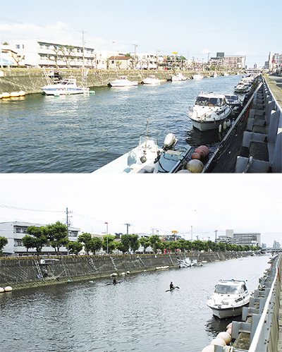 以前から常態化していた不法係留船の問題。1996年度の調査で540隻を確認。以来、船の所有者に自主撤去を促す案内書の送付やマリーナの利用を呼び掛けてきたが、これに応じる所有者は少ない。こうした状況下で、県土木事務所では、2008年度から不法係留対策の周知、自主撤去の促進、強制撤去の3つを柱とする活動を展開。今年3月の調査では80隻にまで減少し、現在、森崎橋から梅田橋の間の係留船は完全撤去されている。県は、今年度内の係留船ゼロを目指す。