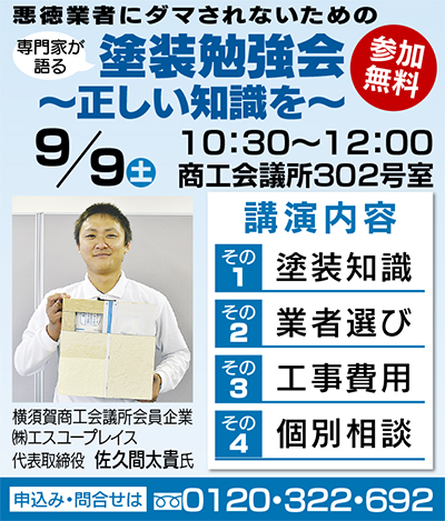 家のひび割れ・雨漏りに対する予防や修復を行う外壁塗装に関しての無料セミナーが9月9日(土)、横須賀商工会議所で行われる。現在一般の参加者を募集している。講師は塗装専門店「(株)エスユープレイス」(大津町)の佐久間太貴氏。