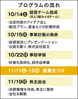 計画が固まったら、投資家役に対して出資を募り、疑似的な株式会社を立ち上げる。仕入れや商品開発を経て、11月11日・12日の本番を迎える流れ。終了後は「損益計算書」「貸借対照表」などの決算書類を作成し、株主総会を開いて出資者に分配。会社を解散し、プログラム終了となる。帳簿の記入など一連の過程を体験する中で、司法書士や公認会計士、税理士などの専門家からアドバイスも受けられる。