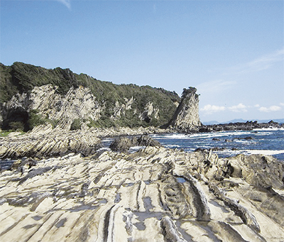 海岸美に富んだ岩礁が続く毘沙門=写真。自然がつくる地形を楽しみながら白浜海岸、毘沙門洞穴を歩き、盗人狩、宮川湾や北条湾を経て、三崎下町までの約7Kmを散策する。