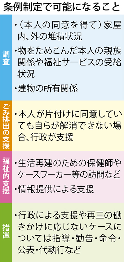 また、地域の民生委員などを通して福祉部や健康部が対応しているケースでは、「精神疾患や認知症などで生活管理ができない」「近隣との関係不和」等の例がある。ごみを処分しても再び元の状態になることもあり、「セルフネグレクト」など、対象者が抱える生活上の問題解決も必要とされている。条例の制定により、連携した支援の態勢を整えることができるという。