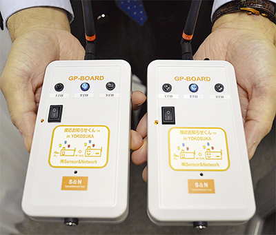 導入するのは、その名も「接近お知らせくん」。移動販売業者向けに開発されたもので、販売者が持つ親機が複数の子機に接近していることを、ランプと音で周知する。3種類のランプは地区ごとに色分けされ、移動販売車の到着や現在地を示すことで、消費者の買い逃しなどを防ぐ。ボタン一つで操作が可能なため、高齢者や通信機器に慣れていない人にも使いやすい。開発したのは、YRPにある株式会社S&N(センサー&ネットワーク)。今年1月に設立したばかりの新興企業で、通信技術を応用した機器を手掛ける。