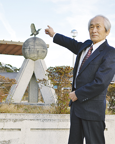 正面玄関のそば、校庭を見渡す場所に鎮座しているのが「善意の塔」。校舎改築に伴って再建されたもので、現在3代目。”初代”が作られたのは1966年だった。63年から12年間、美術教員として勤務していた慶長敏彦さん(83歳・小原台在住)が、当時の校長(第7代・佐藤明氏)から、「善意の気持ちを生徒に伝え続けるシンボルを作れないか」と依頼を受け、塔のデザインを手がけた。球体の上に平和の象徴である鳩が翼を広げて止まっている姿は、代替わりしてもそのままだ。