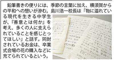天候や季節、草花を愛でる言葉から始まる手紙。これが50年以上、市立田浦中学校に届いている。その間隔は時期によって、不定期のこともあったというが、ここ最近は毎月。「同封のものを役立てて」と言葉を添え、いつも2000円くらいの現金が入っている。差出人は匿名で、消印は横浜金沢や久里浜、藤沢など県内各地のときもあれば、蒲田や秋田から送られることも。校内では、いつからか「善意の人」と呼ばれるようになっていた。