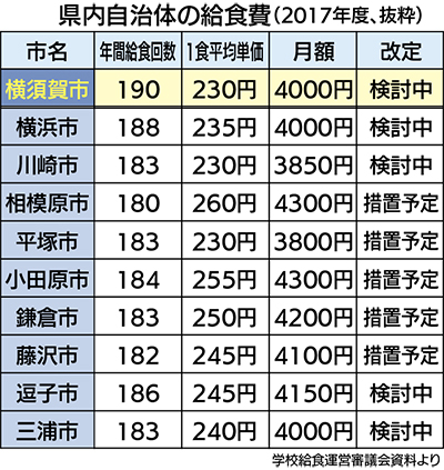 給食費改定は、他の自治体でも検討されている。現状で4000円前後が多く、県内19市の平均は4122円。値上げ以前の1食あたりの単価は横須賀市が最低水準だった。横浜市は「国産率の維持と多様な食材の使用、品数・和食の充実」などを掲げ、来年秋に4600円へ値上げする方向で議論が進んでいる。