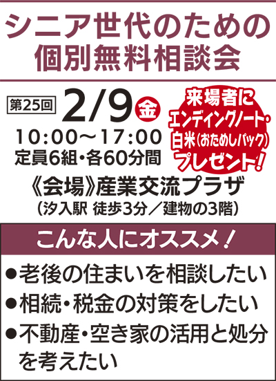 相続、空き家、不動産にまつわる相談に各分野の専門家が応えていく一般社団法人「かながわ相続・不動産・空家相談センター」では2月9日(金)、シニア世代を対象にした無料個別相談会を開く。