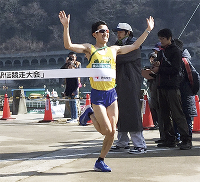 チームは、2区の滋野聖也選手(星槎道都大)、3区の内田隼太選手(法政二高)の快走で2位に浮上。最終7区で秋澤啓尚選手(神奈川大学)=人物風土記で紹介=が先頭に躍り出ると、そのままゴールテープに飛び込んだ。監督の加藤将さん(長井中教諭)は「何よりも頑張ってくれた選手たちを称えたい。チームに携わった方々が喜んでくれているのがうれしかった」と話した。