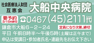 JR大船駅から徒歩5分、地域の中核病院として65年の歴史を有する大船中央病院(須藤博院長)による出張公開講座が3月16日(金)、逗子文化プラザさざなみホールで開催される。時間は午前10時から11時30分まで(開場9時30分)。当日は同院副院長で内科系代表の猿田貴之医師が司会進行を務め、2部構成で実施される。