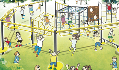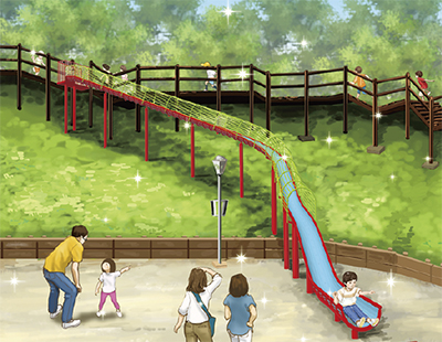 空中移動をコンセプトとしており、切れ目なく連続するアイテムで子どもたちのチャレンジ精神を刺激する。横須賀市のキャラクター「スカリン」がデザインされた周回型の滑走遊具のほか、安全に走り回れる幼児用エリアも新たに設けられた。
