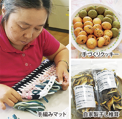 作業訓練の一環として手掛けている手編みマット、アクリルタワシ、クッキー、陶芸品のほか、施設内で栽培している干し椎茸などが並ぶ。
