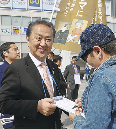 初日には、按針ゆかりの4市の市長・議長が横須賀中央駅前で署名を呼び掛けた。上地克明市長は「按針の大河ドラマ化が横須賀復活の鍵を握る。ぜひ実現させたい」と声を張り上げた。