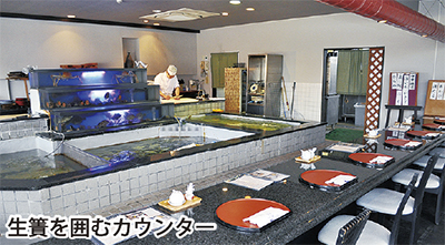 久里浜にある海鮮料理店「生簀屋 海」が先月リニューアルオープンした。その名の通り大きな生簀を囲んで、地場産の新鮮な魚介類を堪能できるのが最大の特長。鯛や平目、イカ、カサゴなど豊富な種類の中から、網ですくってその場で調理してくれる。一番人気の「イカ活造り」をはじめ、江戸前寿司や会席も楽しめる。東京湾を一望できる広々とした座敷もあり、ちょっとした集まりに最適だ。