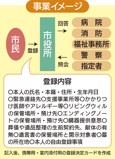 市では、「終活情報登録伝達事業(わたしの終活登録)」の申請用紙を作成。本人の氏名・本籍・住所・生年月日、エンディングノートの保管場所・預け先、葬儀や遺品整理の生前契約先、墓の所在地など11項目を記入できる。市民であれば登録可能で、書面のみの管理となる。本人に万一のことがあった際、医療機関や消防・警察・福祉事務所と指定した人に市が開示する。お墓に関しては死後、納骨や墓参など本人が希望するすべての人に伝えられる。